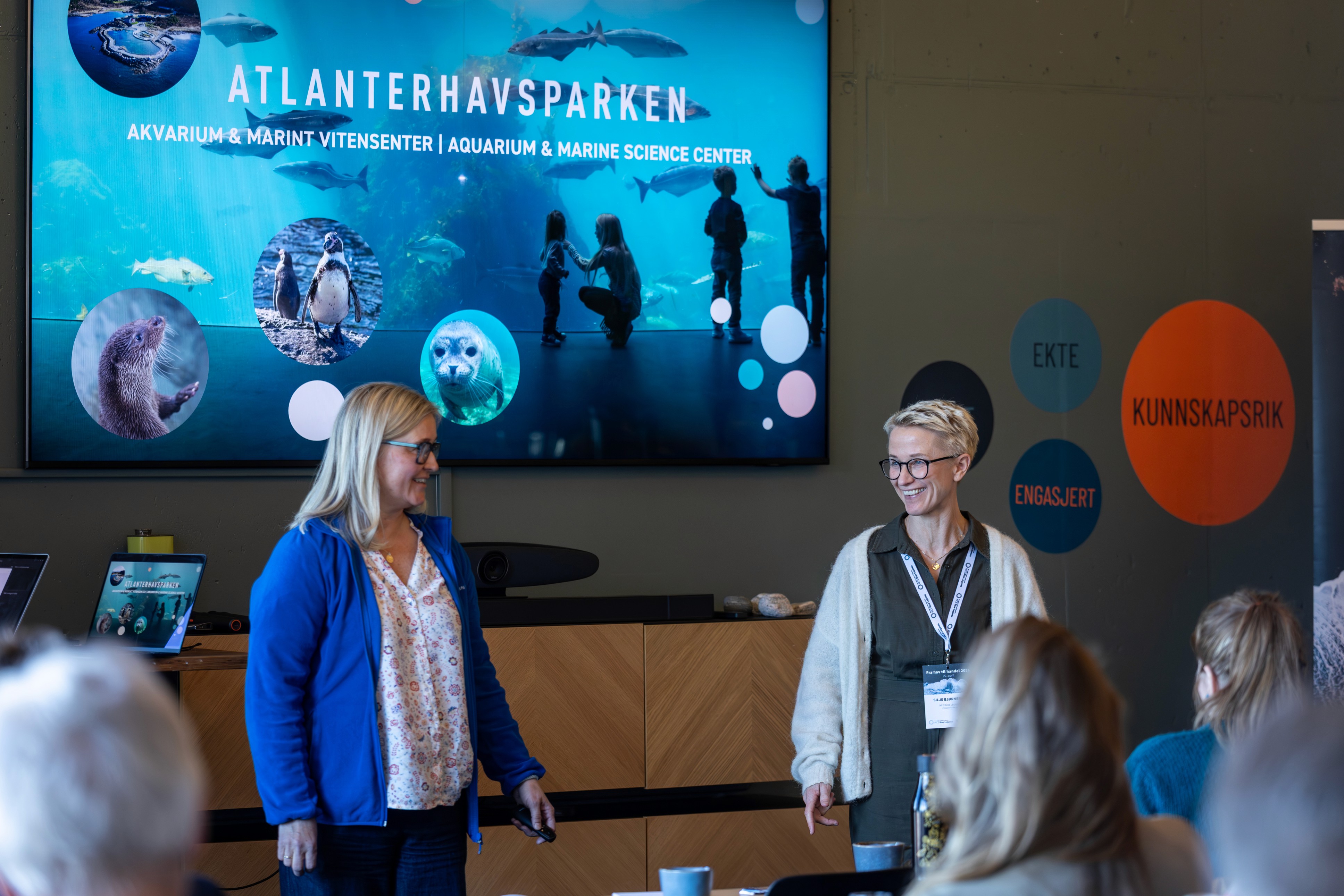 Heidi Bostad Roaldsand forteller om Atlanterhavsparken, ved siden av prosjektleder Silje Bjørnerem. Foto: Anne Marthe Vestre Berge.